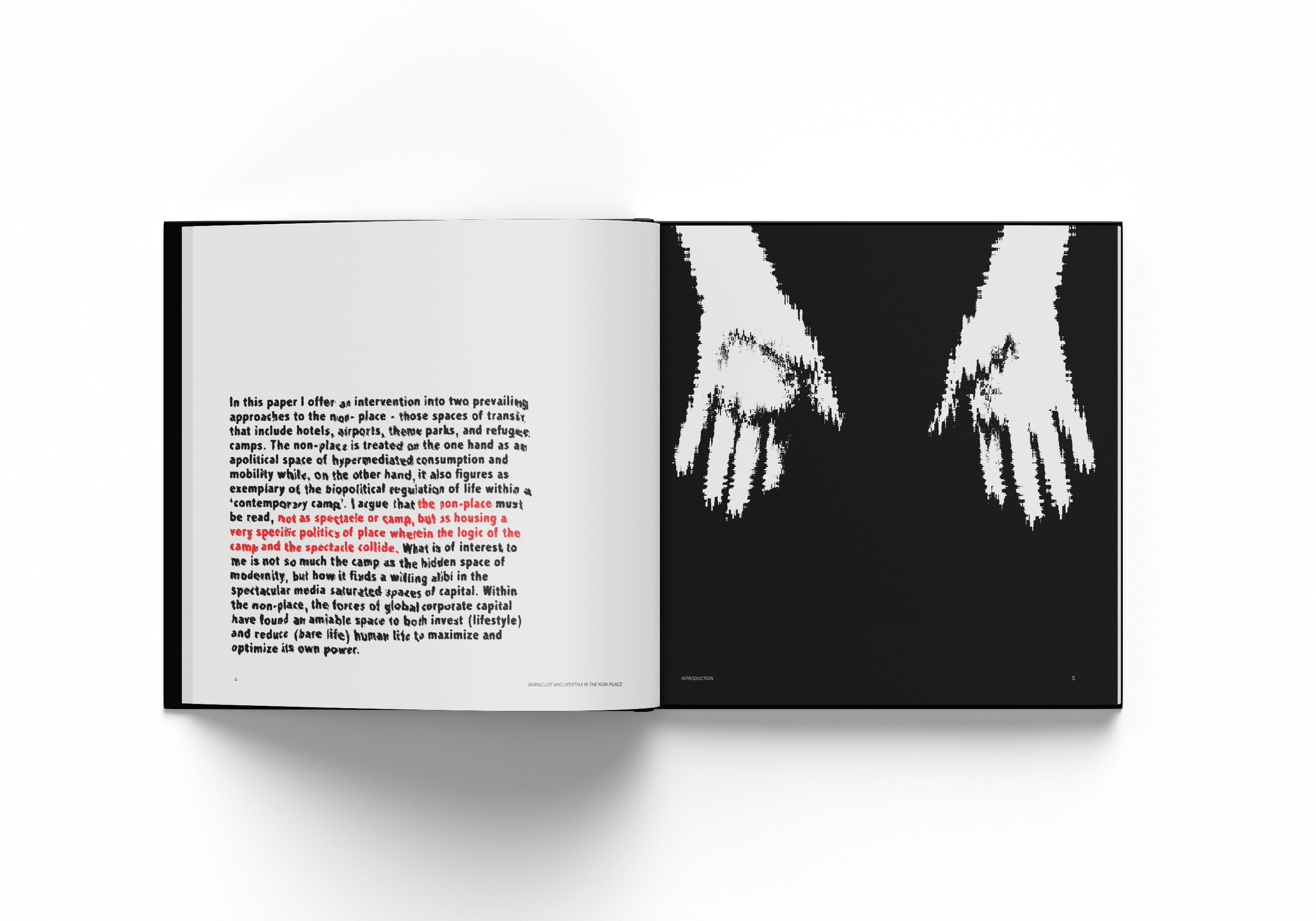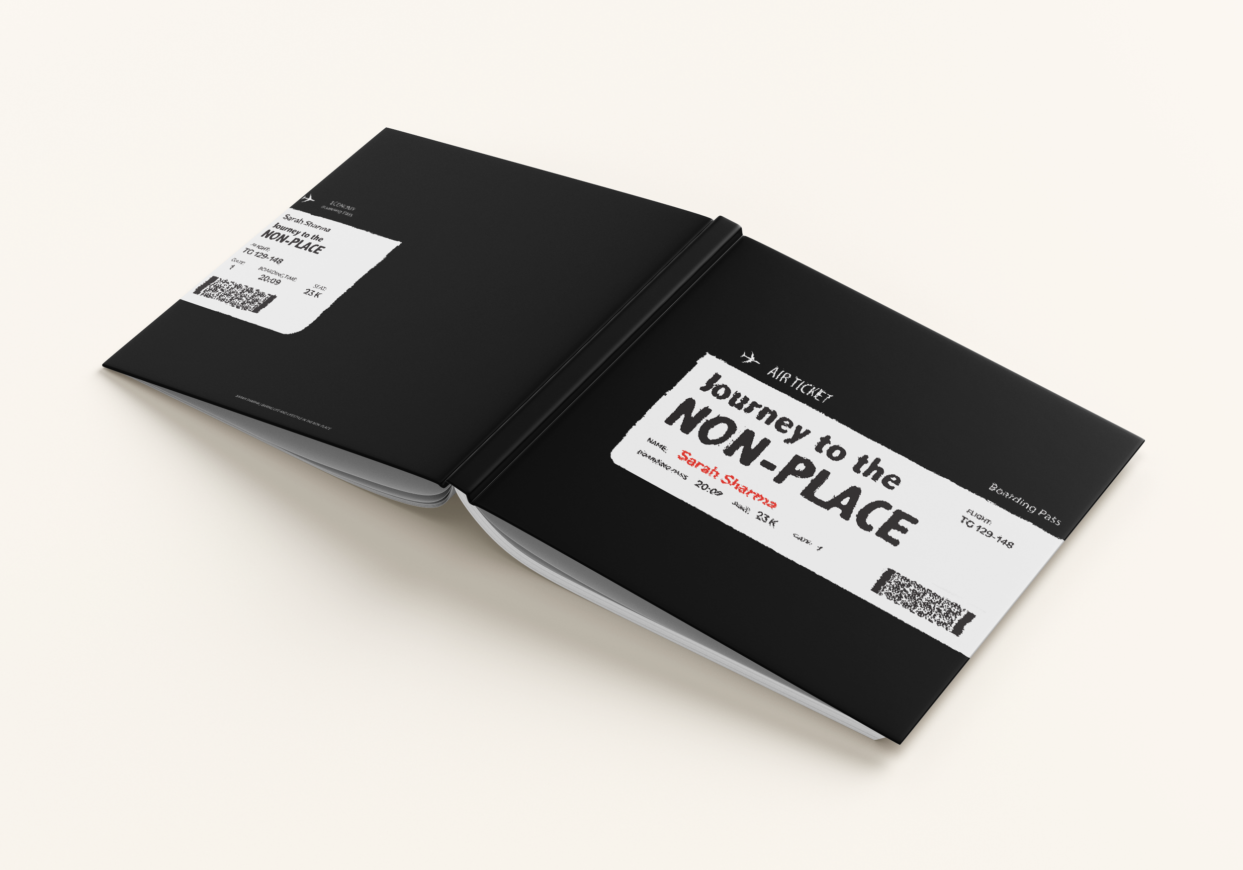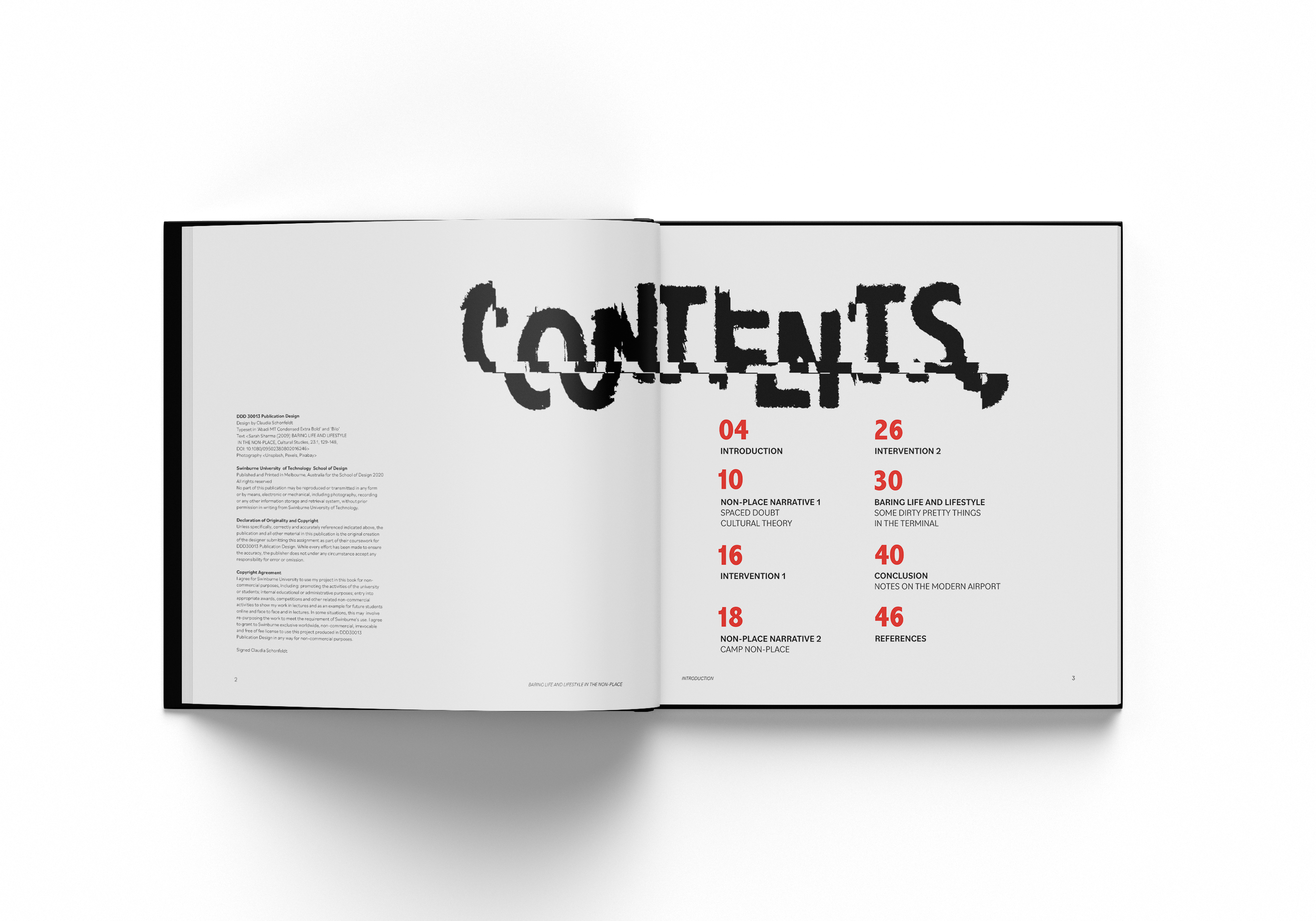 The publication uses a contemporary and brutalist approach to reflect the text’s question of whether non-places are truly artificial and soulless. Images and typography were treated to reflect the idea of passport stamps and personal information inked into personal identification documents often seen in non-places.